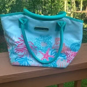 Pretty zipper top insulated bag. Coral, starfish and shells. Interior is orange with shell pattern. One exterior zippered pocket. Pet and smoke free home.