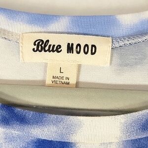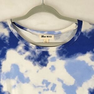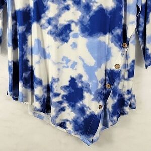 Stylish Blue Mood tie-dye top with a unique asymmetrical design. Perfect for casual outings. Features a comfortable fit and eye-catching cloud pattern. The asymmetric hemline is embellished with decorative buttons! See photos for fabric content and easy care! Make an offer!