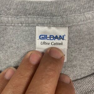 This Gildan long sleeve tee in gray features a striking maroon logo on the chest, offering a vintage-inspired look. Made from a comfortable cotton blend, it boasts a classic crew neck and ribbed collar, perfect for casual outings.