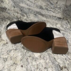 Elevate your style with these Toms heeled boots, featuring a sleek black design and a chunky wooden-look stacked heel. The open toe and side cutouts add a modern touch, making them perfect for both casual and semi-dressy occasions.