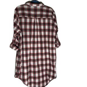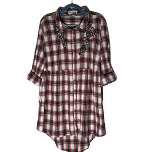 Seventh Avenue Red White Plaid Empire Waist Button-Down Shirt Floral Embroidery