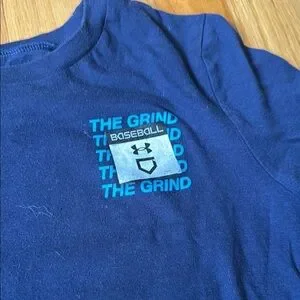 Under Armour set with two tees and shorts. Includes gray and navy shirts. Gray shorts with logo detail. Ideal for everyday wear. Gently used. Navy shirt is size S. Grey shirt and shorts are size 7.