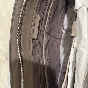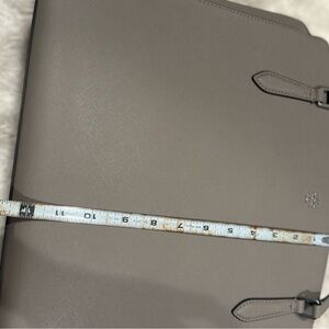 Chic Tory Burch tote in beige leather. Sleek design with signature logo. Ideal for everyday use.