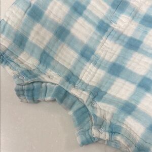 Muslin romper with a light blue and white design. Ideal for everyday wear. 100% Organic Cotton Muslin