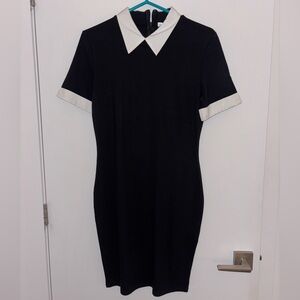 This sophisticated sheath dress by Revamped features a striking black and white contrast with a charming Peter Pan collar. Designed for both work and casual settings, it boasts short cuffed sleeves and a mini length for a chic, modern look.