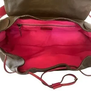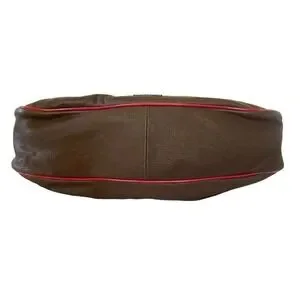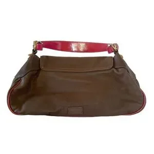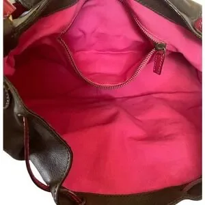 Supple brown leather body with bright magenta pink patent leather piping and trim.