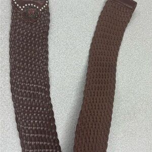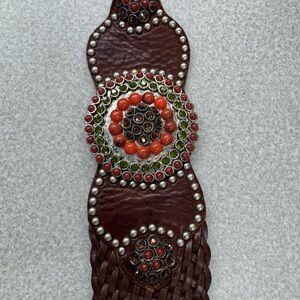 Stylish brown leather bely featuring red and green bead accents. Perfect for adding a pop of color to any outfit.