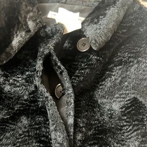 Chic black faux fur jacket by Emporio Armani. Ideal for a sophisticated look. Fully lined. Gorgeous fabric. No sign of damage or wear. Excellent condition!!!!! Measurements in photos. One button is broken but it can be replaced. When fastened, buttons are covered. Extra button in pocket. Fits like a women’s L or XL.