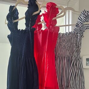 Three Hill House Nap dresses in size medium. The navy and the striped dress both have pockets, the red dress does NOT have pockets. Selling all three together.