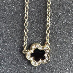 HEIDI DAUS BLACK ENAMEL RHINESTONE FLOWER CLOVER NECKLACE. Excellent condition never worn... in orignall box. size - minimum length 16 " can extend to 20". pendant is .95"