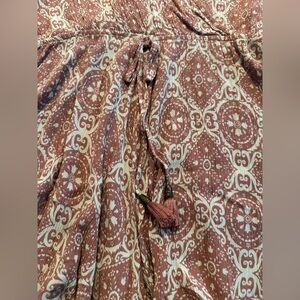 Lovestitch romper with a pink and white pattern. Features a tie waist and flowy sleeves. Perfect for casual outings. No rips or stains offers or welcome bundle and save on shipping.