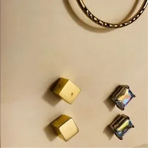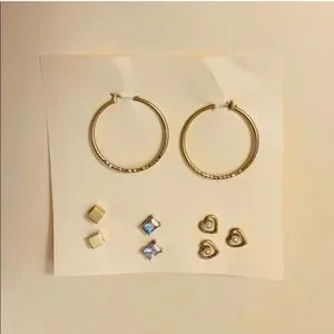 This stunning earring set includes a pair of medium-sized gold hoops with a textured design, complemented by three pairs of delicate stud earrings. The studs feature a variety of shapes, including square and heart designs, all in a matching gold tone. Perfect for adding a touch of elegance to any ensemble.
