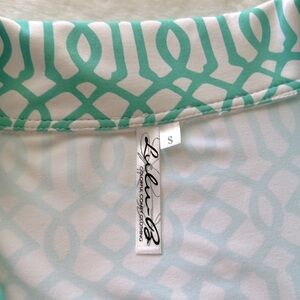 Beautiful Lulu-B dress in lovely turquoise and white geometric print. Soft and silky with nylon/spandex material blend, with plenty of stretch. Wrinkle resistant and great for travel. Pristine condition. Measurements are bust across=17”,