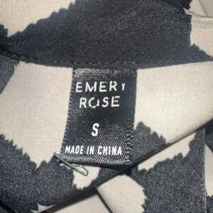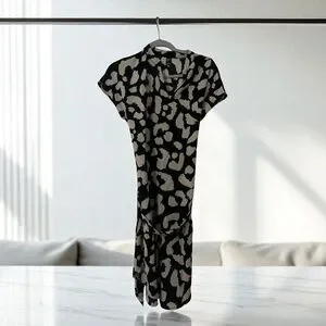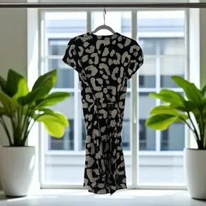 NWOT Trendy Emery Rose short-sleeve dress in a bold black and beige animal print pattern. Features a flattering v-neckline, self-tie waist belt for adjustable fit, and a lightweight drapey fabric. Perfect for casual outings, vacations, or a fun dinner date. Size Small, made in China, in excellent condition.