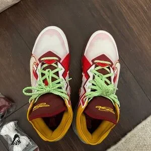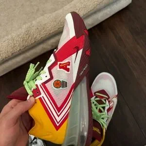 Dynamic Nike sneakers with a vibrant mix of red, yellow, and green. Bold design with unique accents.