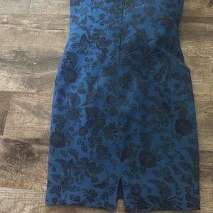 Zac Posen Floral Blue & Black Strapless Strings on Inside Dress Size 6 Zipper on the back with a clasp as well. Couldn’t get the back side of the dress to stay on the maniquine even with clips so I had to put it on the floor! Pre owned perfect condition!