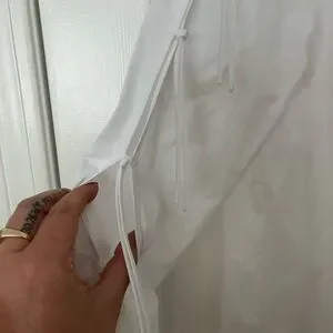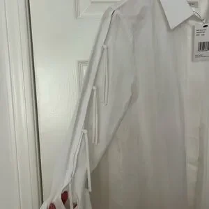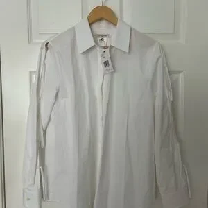 This Lafayette 148 New York dress shirt is crafted in a crisp white hue, offering a polished and professional look. Featuring cute little open ties on the side.