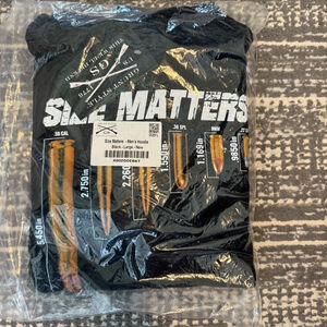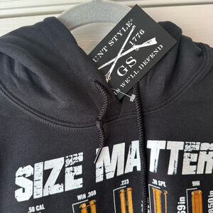 This is a new with tags Grunt Style "Size Matters" men's hoodie, size large. The hoodie is black and features a graphic of various bullet sizes with corresponding measurements on the front. The left sleeve has a white American flag graphic, and the right sleeve has the Grunt Style logo. The hoodie is made of 50% cotton and 50% polyester. It is in new condition and comes in the original packaging.