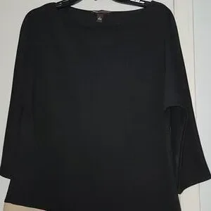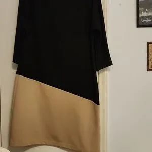 This sophisticated sheath dress by Dana Buchman features a striking asymmetrical design with a black top and tan bottom. The 3/4 sleeves and bateau neckline add a touch of elegance, making it perfect for both work and casual occasions. Its structured fabric ensures a polished and modern silhouette.
