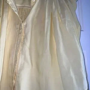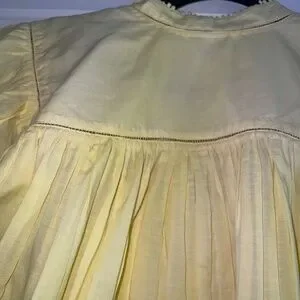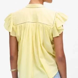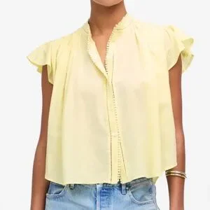 Madewell flutter-sleeve popover blouse in a soft butter-yellow cotton voile. Features airy ruffled cap sleeves, delicate mini-pom trim framing the split neckline and button placket, and gentle gathers at the shoulders that give it an easy, drapey silhouette. Lightweight, slightly sheer and perfect for warm weather; pairs effortlessly with denim or cut-offs. Excellent pre-loved condition with no stains, pulls or missing buttons.