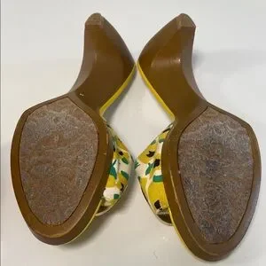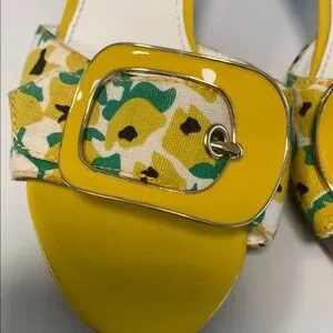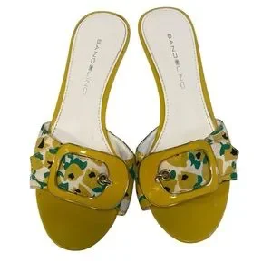 Step into style with Bandolino's vibrant yellow and green sandals, featuring playful embellishments on a suede-like upper. These slip-on sandals are perfect for warm weather, combining comfort with a touch of elegance.
