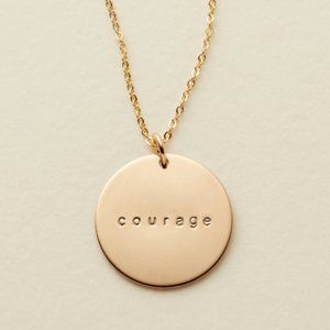 🌸 NEW "Courage" simple disc necklace. Keep this mantra necklace on you to practice courage and mindfulness in the moments of uncertainty, fear, anxiety and wavering: Return to this moment, breathe, and reconnect with yourself to remind yourself that courage starts with showing up and letting yourself be seen. Courage is simply grace under pressure. Practice courage, as it is a muscle and is strengthened with use.