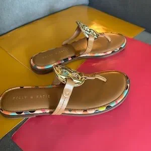 These Kelly & Katie sandals feature a chic brown base with a striking circular medallion decoration, perfect for a casual summer look. The flat sole ensures comfort, while the bohemian-inspired embellishments add a touch of elegance to your outfit.