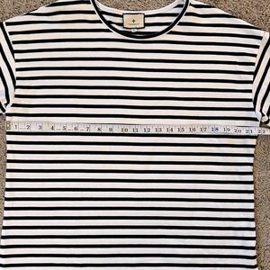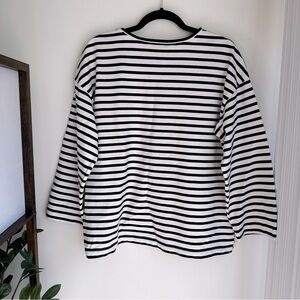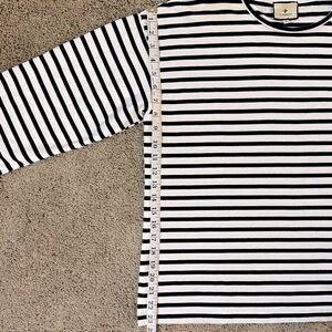 Elevate your basics with this effortlessly chic 3/4 sleeve top from Tuckernuck. Featuring timeless black and white stripes and a flattering, slightly boxy silhouette, this top captures the essence of Parisian-inspired style. The breathable cotton blend ensures all day comfort. Whether paired with jeans for a casual day out or dressed up with a blazer, this piece is a must have for any wardrobe.