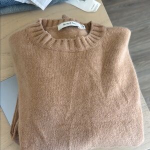 Cozy tan sweater. Ribbed neckline and cuffs. Soft and stylish.