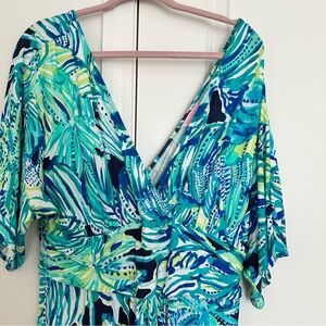 Bold tropical dress with blue and green patterns. Ideal for sunny days.