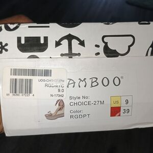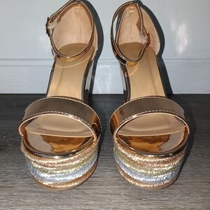 Shiny gold wedges with a chic metallic finish. Comfortable and stylish for any event. this is rose gold.