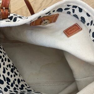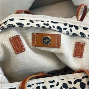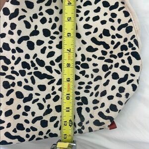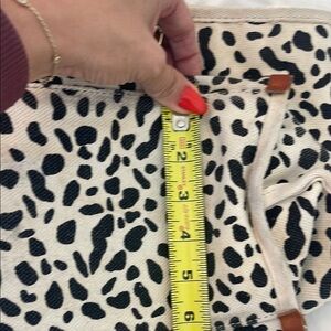 Stylish leopard print tote bag featuring elegant tan straps. Perfect for adding a touch of wild sophistication to any outfit. Cotton with faux leather straps. Has an attached make up bag/wallet with a zipper. Bought this bag from Anthropologie, but has an urban outfitters tag- same company. There is a slight water stain on the bottom of the bag and side water marks, and a few spotting areas but can be cleaned easily. Has a removable leopard canvas to make the bag more structured. Straps are 10” long - all other measurements are pictured. In very good condition would be excellent condition minus the few water spots.