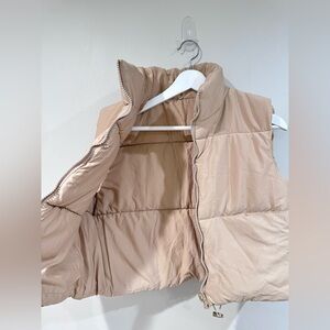 Stylish tan puffer vest with a zip closure. Perfect for layering.
