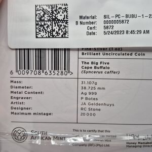 The Big 5 Buffalo One ounce 999 fine silver round featuring a buffalo design. Elegant and collectible. The Big Five Series buffalo coin is the final release in the South African Mint's Big Five II series. The series celebrates iconic African wildlife, with the buffalo representing strength and herd mentality.