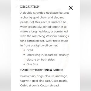 This exquisite CAbi piece is a double-stranded necklace featuring a chunky gold chain and elegant pearls. Each strand can be worn separately, joined together to make a long necklace. Wear the closure in front or slightly off center.