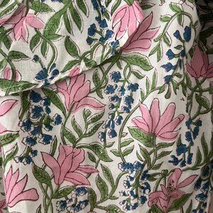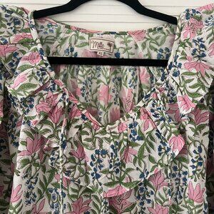 Mille Floral Block Print Long-Sleeved Blouse. Size XS. Runs TTS. 100% cotton. Elastic at wrists allows you to push up sleeves easily if desired. Great floral pattern with pink, green, and blue. Slight v-neck. Only worn a couple times - in pristine condition.