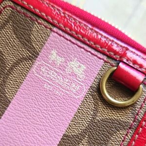 Pre-loved, Coach Heritage Khaki Pink Stripe Medium Zip Wallet in Signature Monogram Canvas Pattern. Minor signs of wear, spots, & measurements are shown in photos & video. SOLD AS IS. MFSRP $178, FACTORY $159