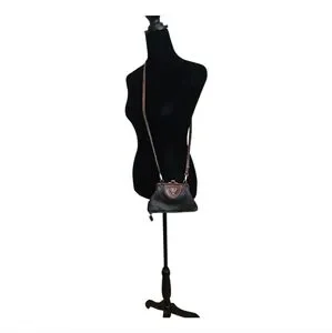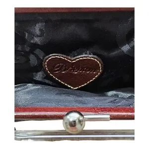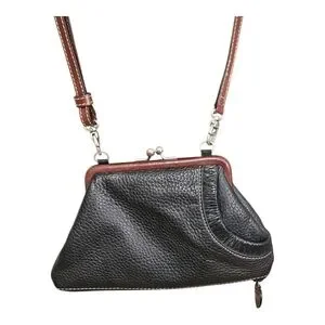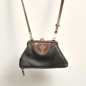 This leather stylish women's bag features a sophisticated black and brown design with kiss lock closure and Brighton's signature hearts. The unique trapezoidal shape is very eye-catching. The straps are removal, and the bag turns into a large coin purse. On the outside, at the bottom, there's a secret compartment with zipper closure. On the back, there's another secret compartment for money, glasses, etc. It's deep with a suede feel inside (soft). Inside the interior, there's a leather heart patch in brown with silky fabric as the lining. This is perfect for any occasion. Its elegant look is complemented by high-quality materials, making it a must-have accessory. Pre-loved EUC. No call outs. Silver and gold hardware. At the longest drop, it measures 30" and the shortest is 16". 8"L x 1/2" D x 4"1/2 H