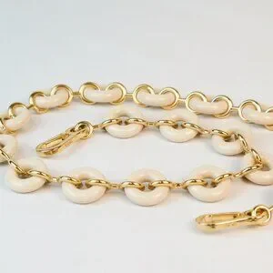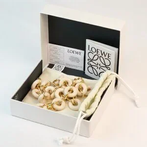 This Loewe Donut Chain is a part of the Paula’s Ibiza collaboration collection. Featuring chunky ivory donut-shaped rings crafted from glossy, high-shine acetate, this piece strikes the perfect balance between bold and elegant. Gold-toned chain links and lobster clasps add a warm, polished finish that complements a wide range of styles. Exceptionally versatile, this standout accessory can be styled in multiple ways. Wear it as a shoulder strap for smaller bags, as an accent chain for larger totes, or even clipped onto belt loops to elevate a casual outfit with designer flair.