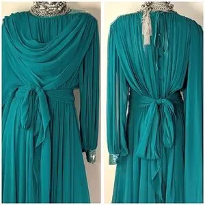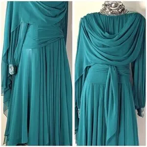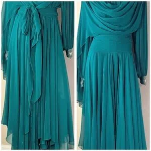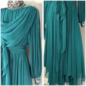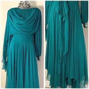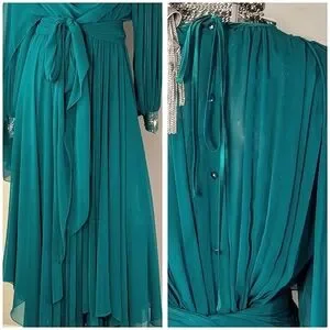 VinTAge Wedding Evening "Mother of Bride" Whimsical Fairy Core Fluid Chiffon Dress Features Satin Crew Cut Neckline, Beaded Applique with Hanging Fringe Beaded Design @ Top Left Shoulder, Draping Chiffon @ Front, Pleaded Top Front Under Draping, Sheer Chiffon Bishop Sleeves with Beaded Applique Design & Two Rhinestone Buttons @ Wrists, Sheer Attached Chiffon Scarf/Sash @ Back Top, Pleaded Chiffon Back @ Top, Rhinestone Buttons @ Center Back, Satin Tie @ Back Neckline, Fit/Flare Chiffon Circle Bottom, Elastic @ Waistline, & Unattached Matching Sheer Chiffon Sash/Scarf/Belt... (Measurements as Follows: armpit/armpit 19" wide, shoulder/hemline 52 1/2" long, shoulder/wrist 24 1/2" long, shoulder/shoulder 18" wide, waist 11" (22") wide (stretched 15" (30") wide)(No Labels are Attached)
