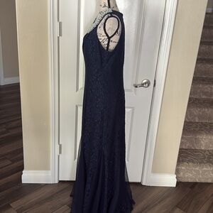 This stunning blue gown by R&M Richards showcases a sleeveless halter neckline adorned with shimmering silver and pearl embellishments. Perfect for making a statement at weddings or cocktail events. The rich blue fabric flows gracefully to a maxi length.