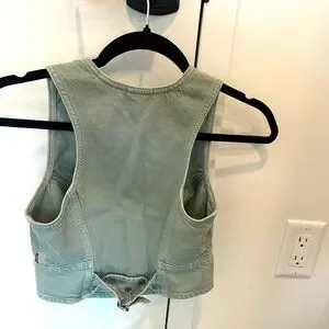 Levi's Cropped Denim Vest in XS (tag print error had XXS but it’s XS) in a unique light blue-green denim. Button-up front. Sleeveless style.