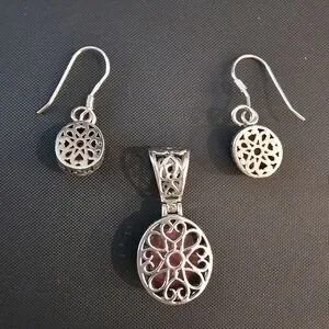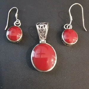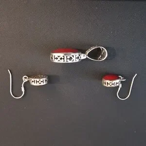 Silpada Sterling Silver and Red Carnelian Pendant And Earrings. This elegant jewelry set features a striking red and silver filigree design, perfect for adding a touch of sophistication to any outfit. The set includes a pendant and matching earrings, crafted with attention to detail.