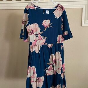 Girls Floral Blue Dress with Pink Flowers - Size L