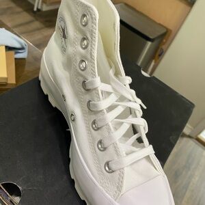 Elevate your style with these Converse high-top All Star sneakers, featuring a clean white canvas upper and a chunky platform sole. The signature star logo patch adds a classic touch, while the rugged sole pattern offers a modern twist. Perfect for making a bold statement in any casual setting.