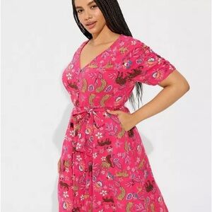 This Torrid sundress showcases a vibrant pink color and a chic wrap design, complete with a v-neckline and puff short sleeves. Ideal for casual or resort wear, the dress features a tie front and a flowing maxi length, offering both comfort and style for warm weather days.