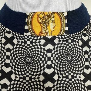 Pattern featuring circular motifs resembling ancient coins or medallions. Each motif depicts a profile bust, likely representing a historical or mythological figure, within an ornate, possibly gilded, frame. The background fabric features a geometric pattern of black and white, including checkered and radiating line designs.