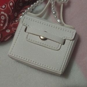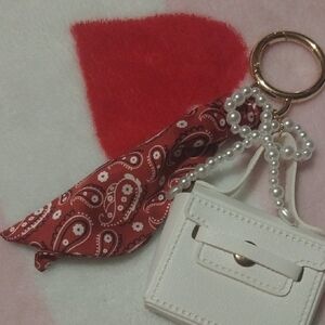 This chic white mini bag keychain features a stylish red scarf accent and pearl detailing. Perfect for adding a touch of elegance to your accessories collection.