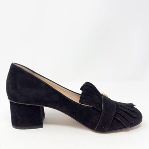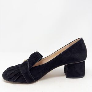 Shoes, mid heel, low heel, block heel, loafer, Gucci Marmont black suede loafers, Gucci GG fringe block heel pumps, Gucci mid heel suede shoes, Authentic Gucci Marmont loafers, Gucci black GG logo shoes, Gucci suede fringe heels, Gucci chunky heel loafers, Gucci black suede shoes women, Gucci classic loafers with gold hardware, luxury, designer, office heels, block heel pumps, fringe loafers, designer work shoes, Gucci shoes for women, gg logo shoes, classic black pumps
