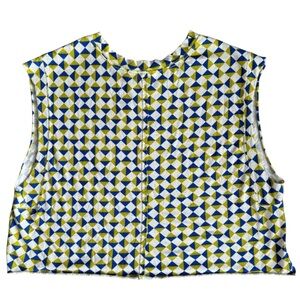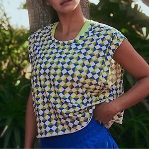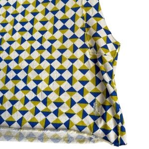 Chic tank top with bold geometric design. Features blue and green triangles. Ideal for a trendy look.